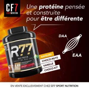- La WHEY R77 est la première whey sur le marché qui dispose d’un ingrédient booster de testostérone naturel, le DAA, inclut également la créatine pure et EAA. Chaque produit CF7 sport nutrition dispose en majorité d’une spécification comme notre slogan le rappel. Nous l'avons construit pour être different. La gamme R77 est totalement unique. Pourquoi ? Car la WHEY R77…