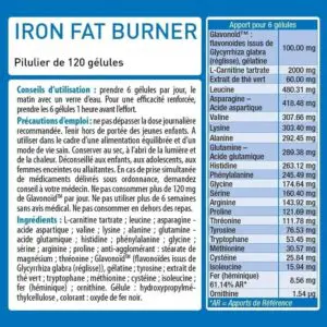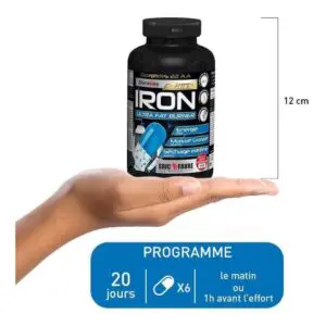 - Iron Ultra fat burner agit sur la masse grasse. - Pilulier de 120 gélules - Exclusivité mondiale : Biaminoée® Dipeptides 22 acides animés + fer héminique : - Bruleur de graisse, scientifiquement testé - Silhouette affinée & sculptée - Energie