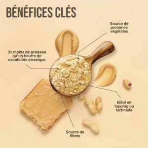 - Idéal pour mettre en topping ou à mélanger avec de l'eau pour tartiner 2x moins de graisses qu'un beurre de cacahuète classique Source de protéines végétales et de fibres Vous avez envie de vous faire plaisir sans manger trop gras ? Notre beurre de cacahuète en poudre 100% dégraissées est fait pour vous. Les cacahuètes sont une source de…