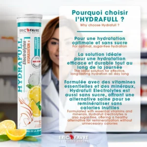 - Eric Favre Hydrafull Electrolytes Hydratation+ est un complément idéal pour maintenir une hydratation optimale pendant l'activité physique. Lors de l'exercice, l'organisme perd non seulement de l'eau mais aussi des minéraux et des sucres. Une baisse de 1% d'eau entraîne une diminution de 10% de la performance, rendant l'hydratation essentielle. Ce produit contient des électrolytes, tels que le potassium, le sodium,…