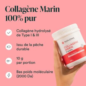 • Collagène Marin en Poudre est une formule de collagène fabriquée par la marque française Novoma. Les peptides de collagène sont hydrolysés avec un bas poids moléculaire de 2000 daltons pour une assimilation optimale. Le collagène présent est une forme brevetée de chez Naticol® (type I et III) et la vitamine C est brevetée Quali®-C, gage de qualité supérieure de fabrication…