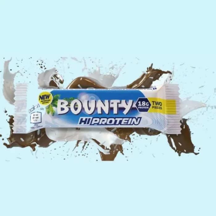 Bounty Hi-Protein est une barre protéinée fabriquée par la marque Mars elle-même. L’usine Mars a créé cette barre protéinée pour faire consommer sa célèbre barre chocolatée au goût de noix de coco à un maximum de personnes et notamment à toutes les personnes sportives. En effet, Bounty Hi-Protein contient 18g de protéines par portion afin de contribuer à augmenter et maintenir la masse musculaire. Nous retrouvons 2 mini Bounty par sachet.