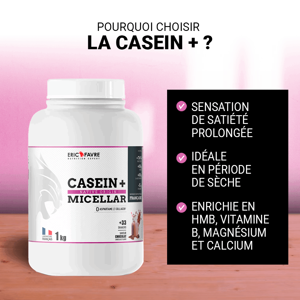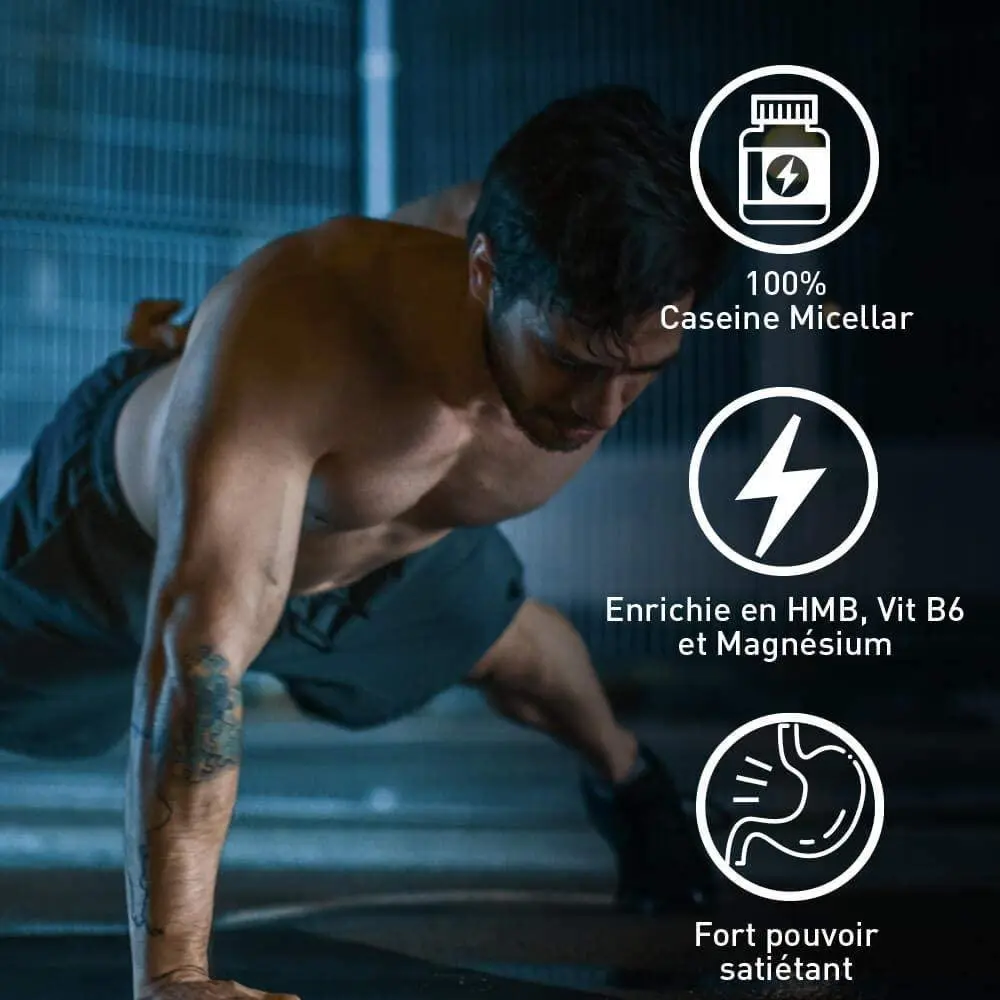 Casein+ est riche en protéine et est composée de la source la plus qualitative de caséine : la caséine micellaire. Cette protéine est très appréciée en période de sèche ou de privation alimentaire du fait qu’elle est assimilée très lentement. Elle est souvent consommée le soir pour favoriser une bonne récupération musculaire. Enrichie en HMB, Vitamine B, magnésium et calcium son efficacité n’en saura que renforcée.