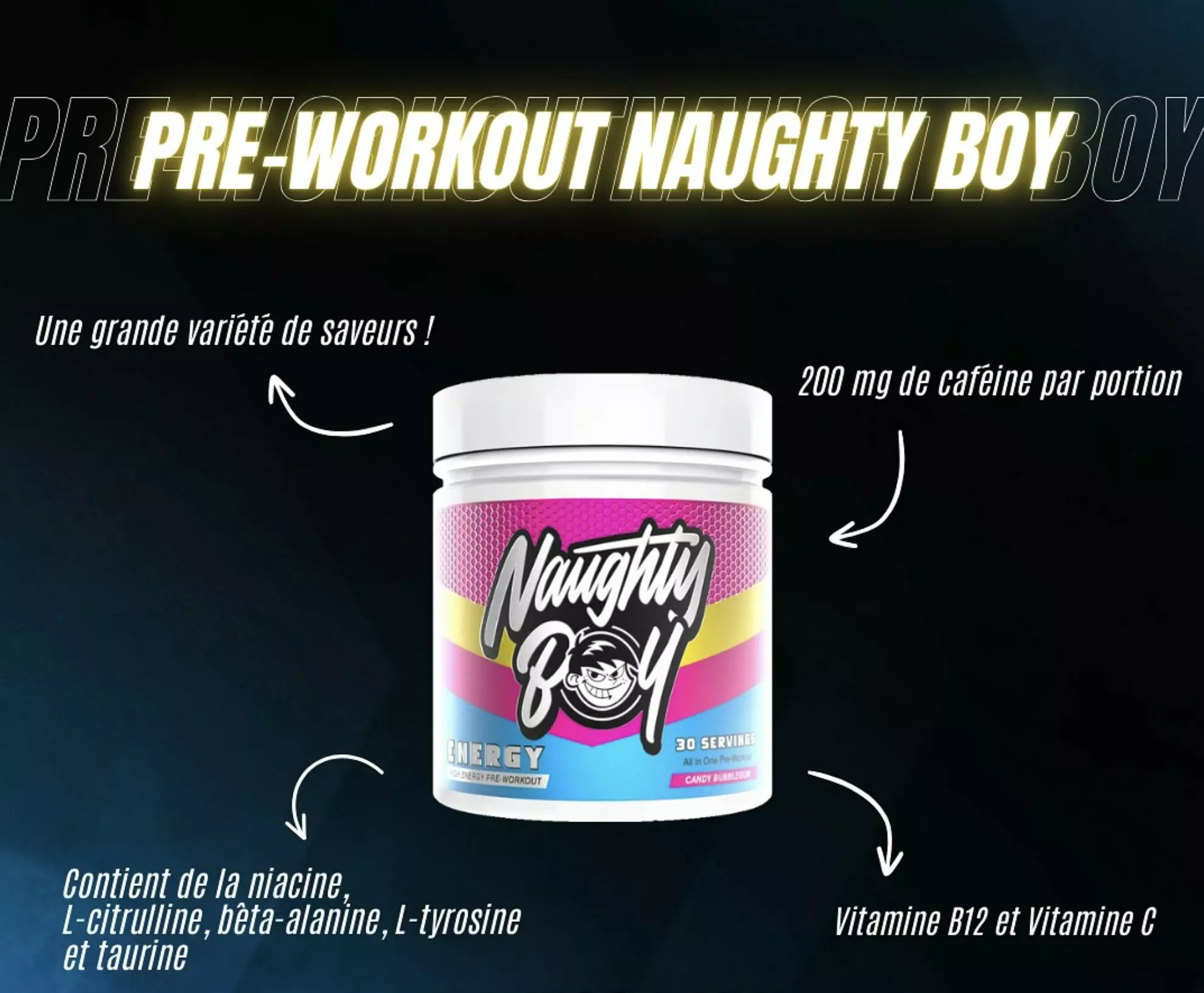 Energy Pre-Workout est une formule de pre-workout fabriquée par la marque Naughty Boy. Ce produit contient principalement des vitamines, des acides aminés, de la caféine ainsi que des extraits de plantes.