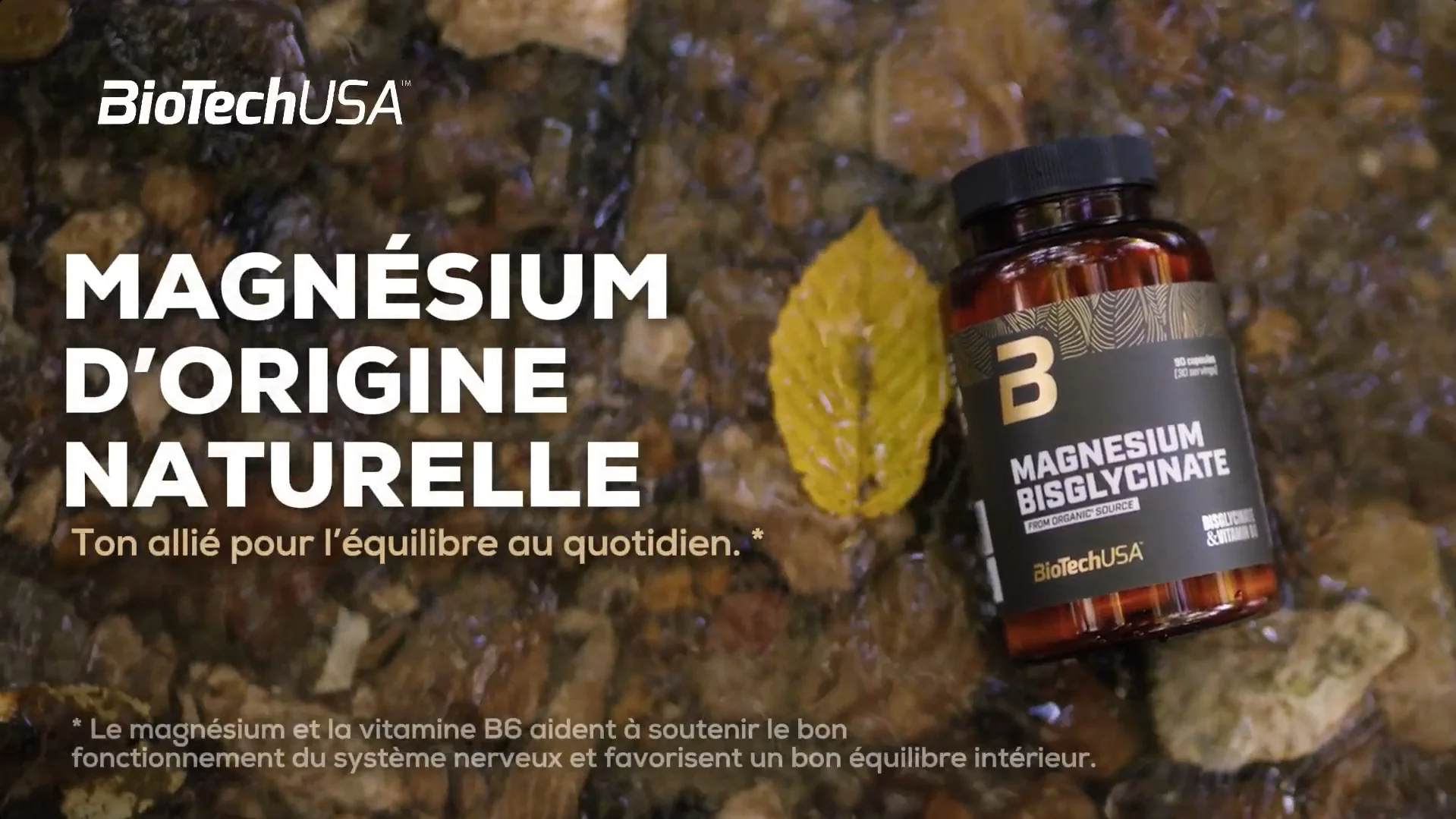 Capsule de complément alimentaire contenant du magnésium chélaté avec vitamine B6. Dans le cas du magnésium bisglycinate, le magnésium est lié à deux acides aminés (deux glycines). En complément des multivitamines, le Calcium Zinc Magnesium from organic sources et le Magnesium Bisglycinate from organic sources aident ensemble à couvrir les besoins en magnésium de l’organisme.