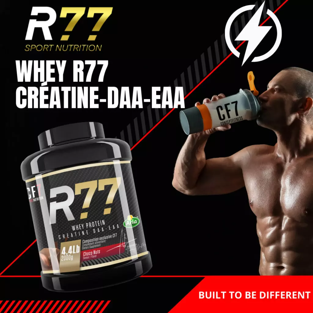 La WHEY R77 est la première whey sur le marché qui dispose d’un ingrédient booster de testostérone naturel, le DAA, inclut également la créatine pure et EAA. Chaque produit CF7 sport nutrition dispose en majorité d’une spécification comme notre slogan le rappel. Nous l’avons construit pour être different. La gamme R77 est totalement unique. Pourquoi ? Car la WHEY R77 est la première whey sur le marché qui dispose d’un ingrédient booster de testostérone naturel. L’acide Aspartique (DAA), qui favorise la production naturelle d’hormone anabolisante associé stratégiquement à une chaîne d’acides aminés complète EAA incluse Essentiel Aminos Acides et aussi de la CREATINE PURE.